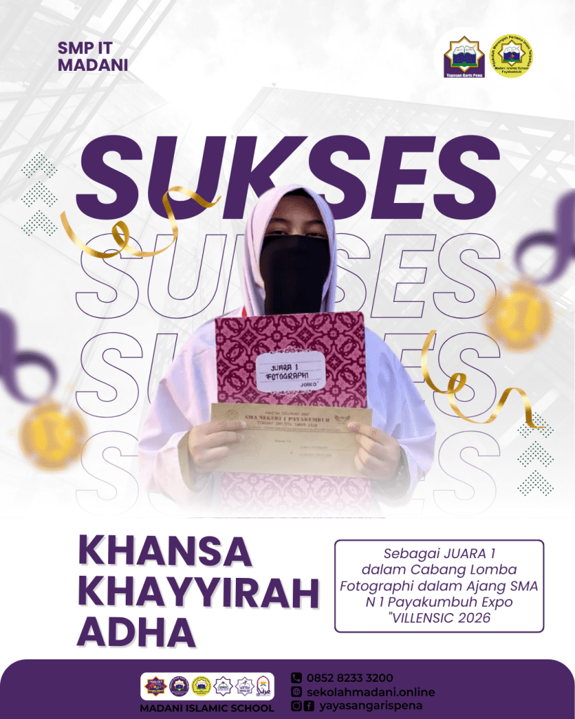 Prestasi membanggakan lainnya datang dari Khansa Khayyirah Adha, siswi SMP IT Madani Islamic School Payakumbuh, yang berhasil meraih Juara 1 Cabang Lomba Fotografi pada kegiatan Expo Villensic 2026. Ajang tersebut diselenggarakan di SMA Negeri 1 Payakumbuh, dan prestasi ini diraih berkat kreativitas, ketajaman visual, serta kemampuan artistik yang luar biasa.